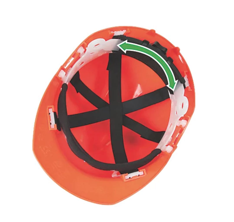 Impact-resistant polypropylene construction with 6 ventilation holes for high breathability. Stainless steel mesh visor and 6-point easy-to-adjust harness.